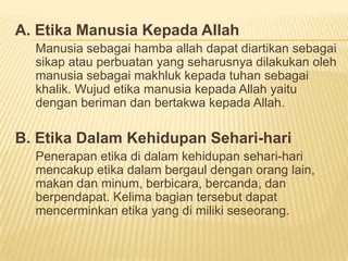 Lebih terperincinya pengertian etika islam adalah tingkah laku manusia yang diwujudkan dalam bentuk perbuatan ucapan dan pikiran yang sifatnya membangun tidak merusak lingkungan dan tidak pula merusak tatanan sosial bupotensi serta tidak bertentangan dengan ajaran islam namun berlandaskan al- Quran dan hadist. Trilogi menuntut ilmu ini tidak boleh lepas dari diri se se orang sebab antara satu dengan yang lainnya mempunyai shilah hubungan yang erat. Sesungguhnya termasuk sikap berlebih-lebihan bila kamu memakan segala sesuatu yang kamu inginkan.